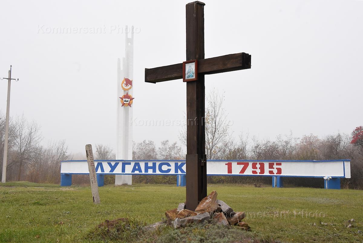 Виды Луганска. Крест на фоне стеллы, посвященной основанию Луганска.