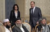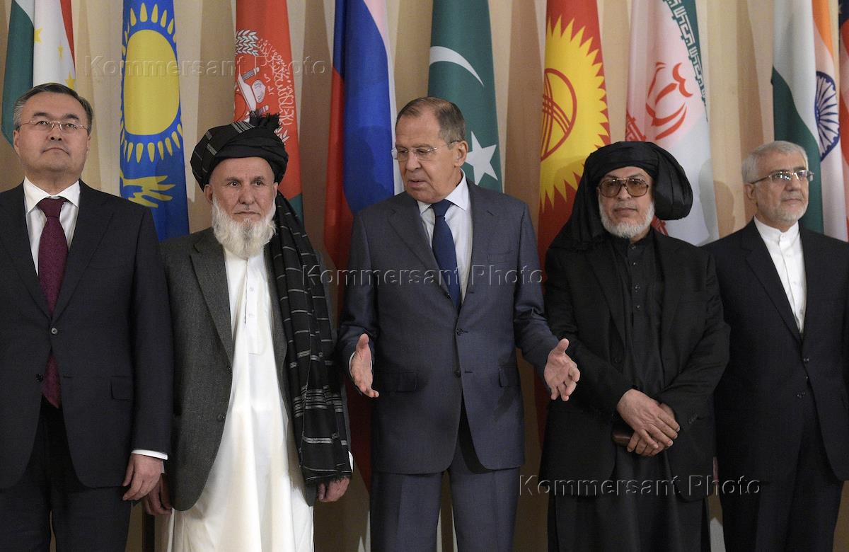 Второе заседание Московского формата консультаций по Афганистану прошло в "Президент-отеле". Министр иностранных дел России Сергей Лавров (в центре) и представители радикального движения "Талибан" (запрещено в России) (справа) во время заседания.