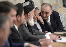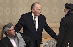 Второе заседание Московского формата консультаций по Афганистану прошло в "Президент-отеле". Чрезвычайный и полномочный посол Афганистана в России Абдул Каюм Кочай (справа) и член Высшего совета мира Афганистана (ВСМА) Хабиба Сураби (вторая справа) во время заседания.