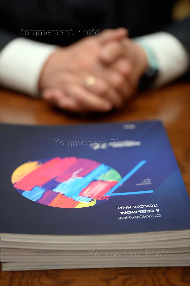 Генералный директор страховой компании "Ингосстрах" Михаил Волков во время интервью. Жанровая фотография. Буклеты о страховании на столе.