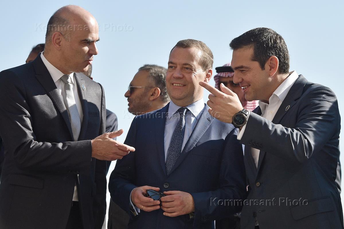 Working visit of Russian Prime Minister Dmitry Medvedev to Palermo. International Conference on Libya. Left to right: Swiss President Alain Berset, Russian Prime Minister Dmitry Medvedev, and Greek Prime Minister Alexis Tsipras during a ceremony of joint photographing at the conference.