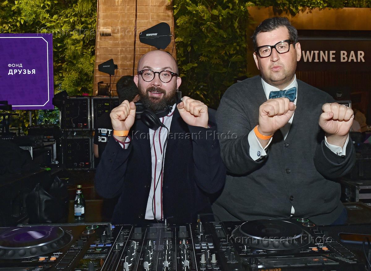 Четвертая вечеринка благотворительного фонда "Друзья" в формате Charity battle FRIENDS-FUN-ROCK’N’ROLL прошла в кинотеатре "Москва". Диджей (DJ) Виталий Козак (слева) и управляющий партнер First Nation Societe Bancaire/FNSB Ян Яновский (справа) во время вечеринки.