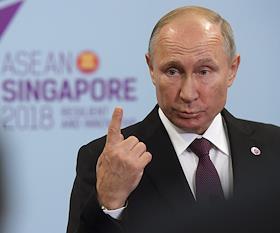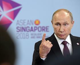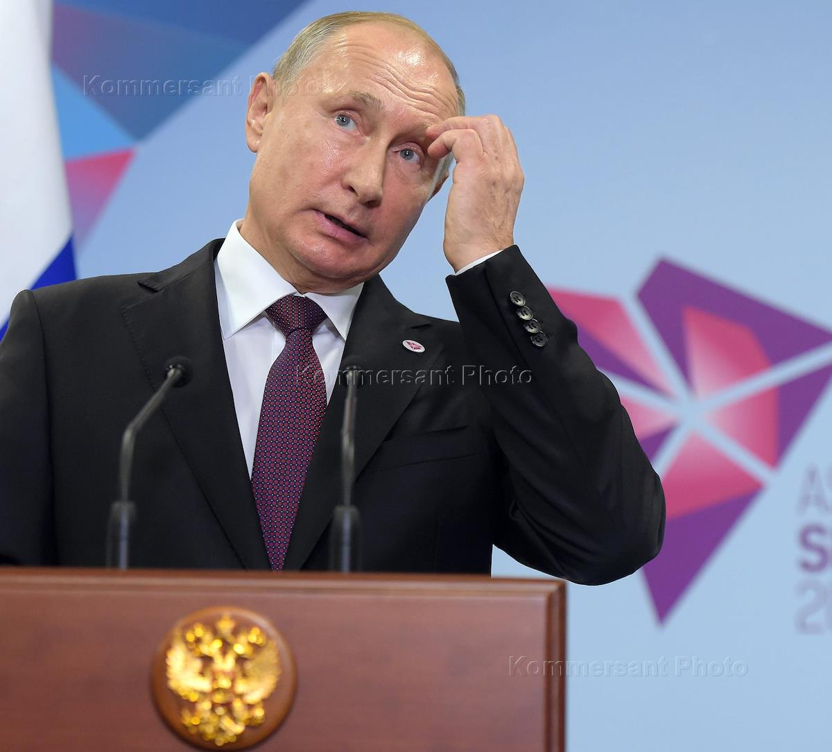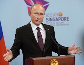 Рабочая поездка президента России Владимира Путина в Сингапур. Саммит АСЕАН. Президент России Владимир Путин во время пресс-конференции по итогам пленарного заседания 13-го Восточноазиатского саммита.