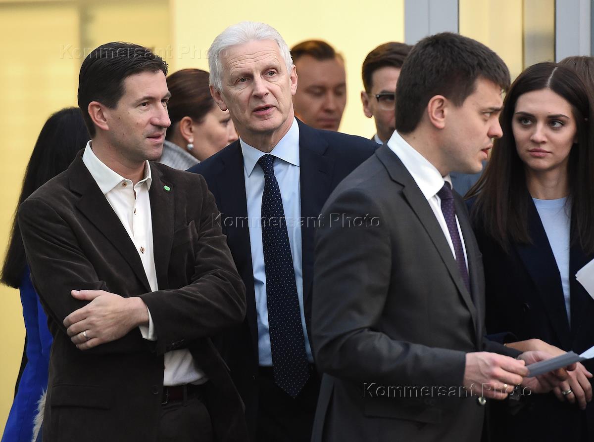 Церемония открытия учебного процесса прошла в школе программирования - "Школа 21" - на улице Вятская. Образовательная инициатива Сбербанка основана на методике "Школы будущего" — инновационной французской школы программирования. Слева направо: помощник президента России Андрей Фурсенко, президент, председатель правления Сбербанка России Герман Греф и министр науки и высшего образования России Михаил Котюков во время церемонии.