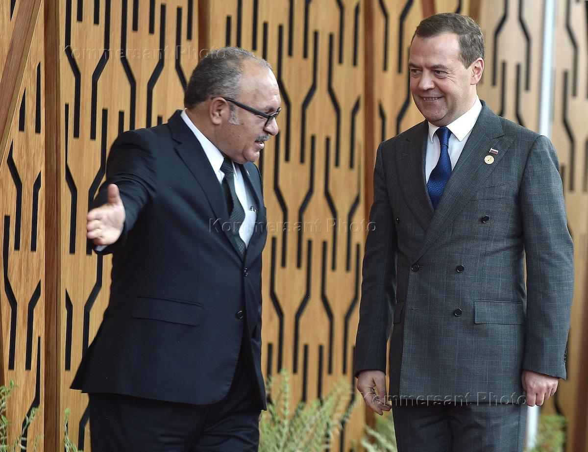 Working visit of Russian Prime Minister Dmitry Medvedev to Papua New Guinea. Papua New Guinea prime minister Peter O'Neill (left) and Russian Prime Minister Dmitry Medvedev (right) before the ceremony of joint photographing of the leaders of the Asia-Pacific Economic Cooperation Economic Forum (APEC).