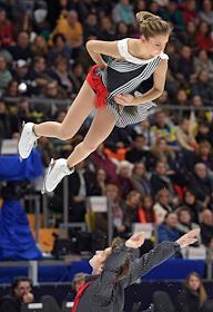 ISU Гран-при "Кубок Ростелеком" - 2018 по фигурному катанию во Дворце спорта "Мегаспорт". Российские фигуристы Евгения Тарасова и Владимир Морозов во время выступления в произвольной программе парного катания.