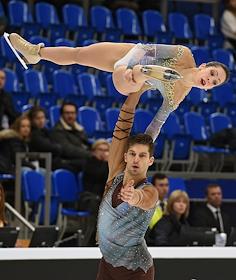 ISU Гран-при "Кубок Ростелеком" - 2018 по фигурному катанию во Дворце спорта "Мегаспорт". Российские фигуристы Алиса Ефимова и Александр Коровин во время выступления в произвольной программе парного катания.
