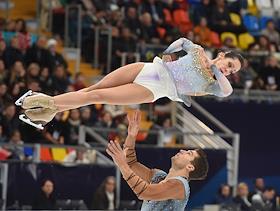 ISU Гран-при "Кубок Ростелеком" - 2018 по фигурному катанию во Дворце спорта "Мегаспорт". Итальянские фигуристы Николь Делла Моника и Маттео Гуаризе во время выступления в произвольной программе парного катания.