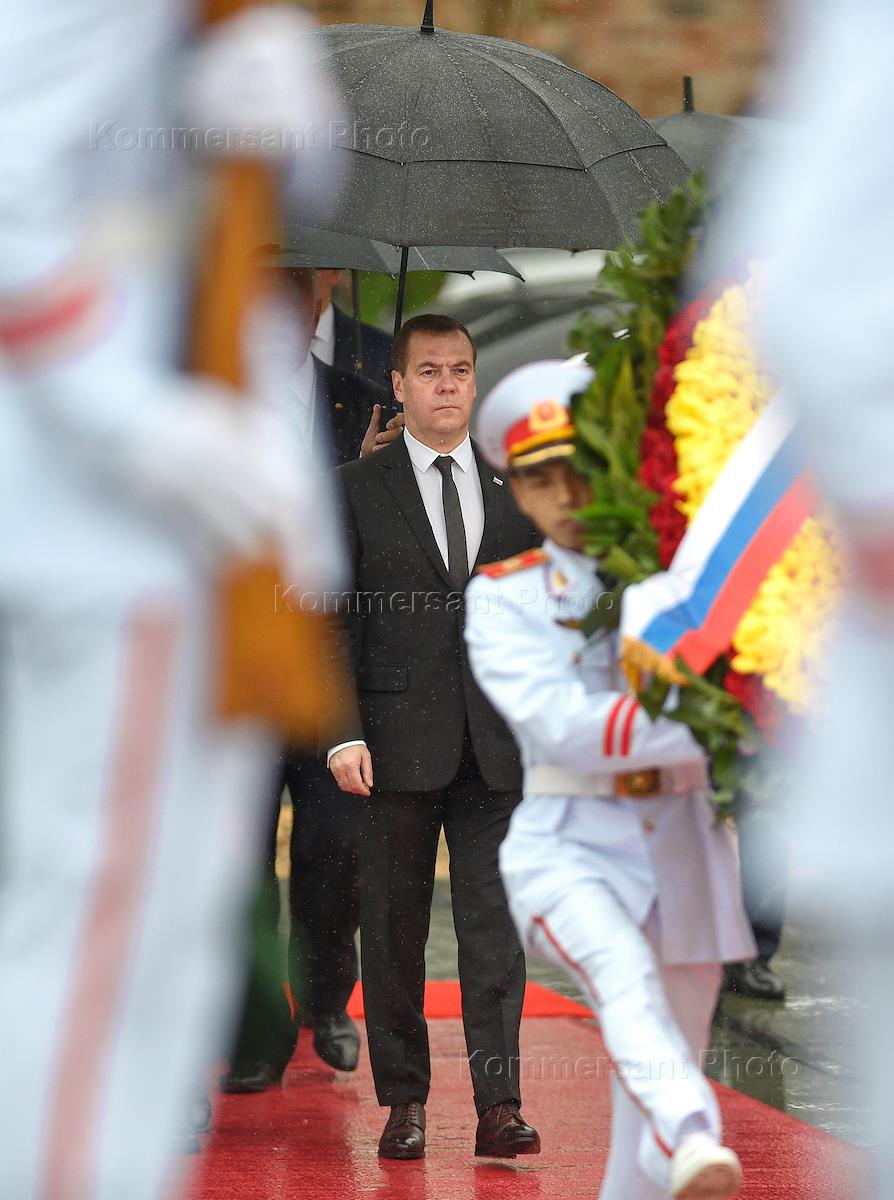 Working visit of Prime Minister Dmitry Medvedev to Hanoi. Russian Prime Minister Dmitry Medvedev (right) during a wreath-laying ceremony at the Ho Chi Minh Mausoleum.