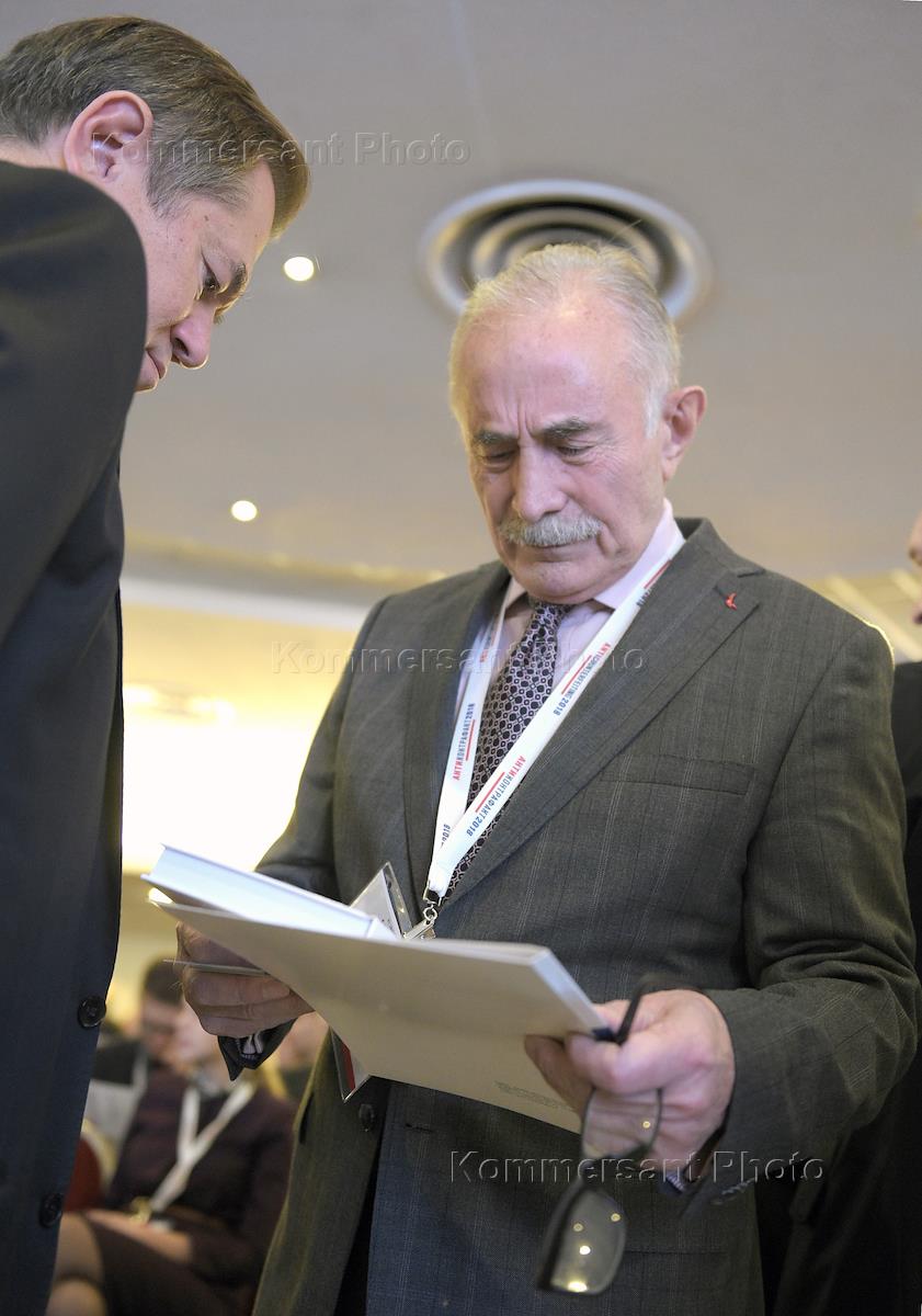 Пленарное заседание VI Международного форума "Антиконтрафакт-2018" в гостинице Azimut Moscow Olympic Hotel. Советник президента России Сергей Глазьев (слева) и президент Международной ассоциации "Антиконтрафакт" Асламбек Аслаханов (справа) перед началом заседания.