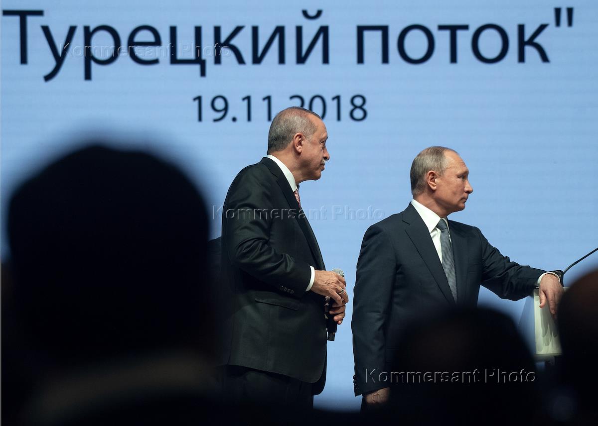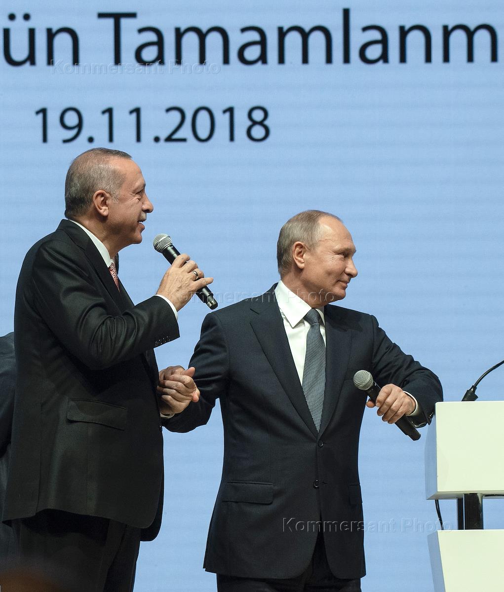 Working visit of Russian President Vladimir Putin to Turkey. Russian President Vladimir Putin (right) and Turkish President Recep Tayyip Erdogan (left) during the ceremony, devoted to the completion of construction of the offshore section of the Turkish Stream gas pipeline in video conference regime at Lutfi Kirdar Convention & Exhibition Centre.