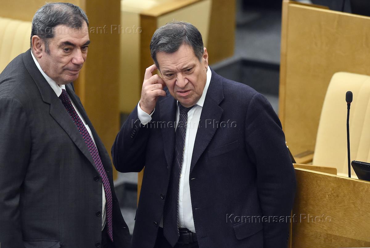 Пленарное заседание Государственной думы (ГД) России. Заместитель председателя комитета ГД РФ по бюджету и налогам Леонид Симановский (слева) и председатель комитета ГД России по бюджету и налогам Андрей Макаров (справа) во время заседания.