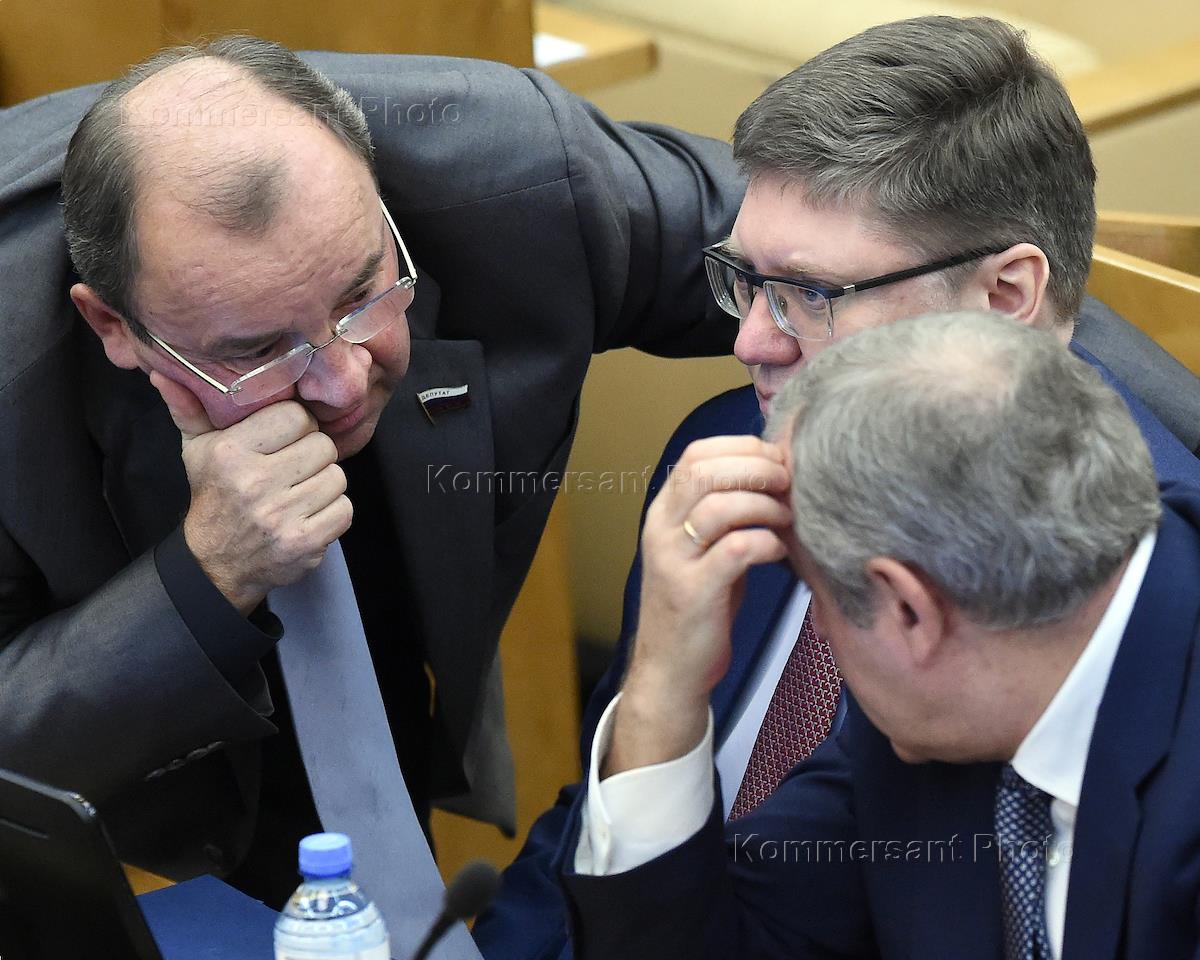 Пленарное заседание Государственной думы (ГД) России. Член комитета ГД России по энергетике Александр Карелин (в центре) и заместитель председателя комитета ГД России по государственному строительству и законодательству Александр Грибов (справа) во время заседания.