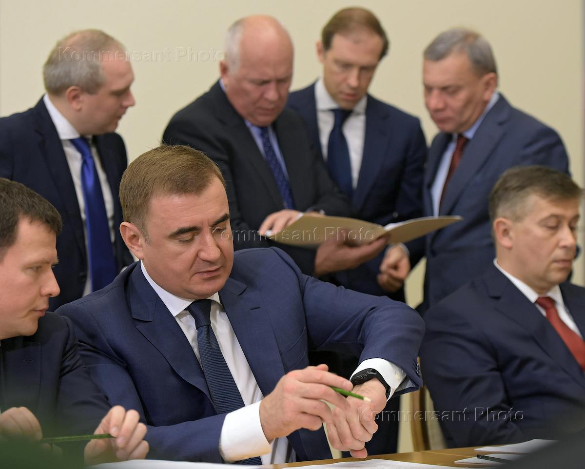 Working visit of Russian President Vladimir Putin to Sochi. A meeting with the leadership of the Russian Ministry of Defense, Members of Parliament and military-industrial complex representatives in the "Bocharov Ruchei" residence. Governor of the Tula region Alexei Dumin (center) during the meeting.