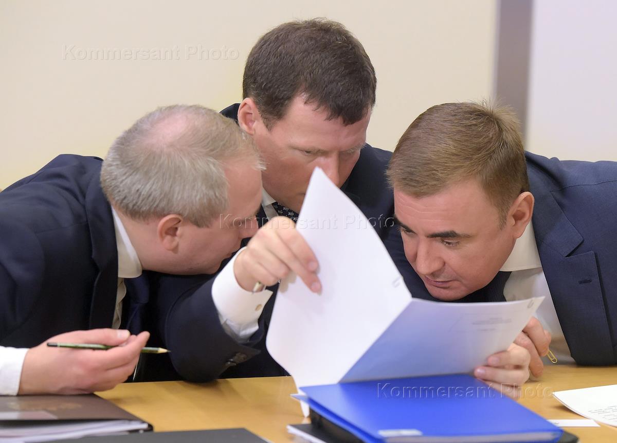 Working visit of Russian President Vladimir Putin to Sochi. A meeting with the leadership of the Russian Ministry of Defense, Members of Parliament and military-industrial complex representatives in the "Bocharov Ruchei" residence. Left to right: Deputy Minister of Industry and Trade of Russia Oleg Ryazantsev, Governor of the Tula Region Alexei Dumin and First Deputy Chairman of the Board of the Military-Industrial Commission Sergey Kulikov before the meeting.