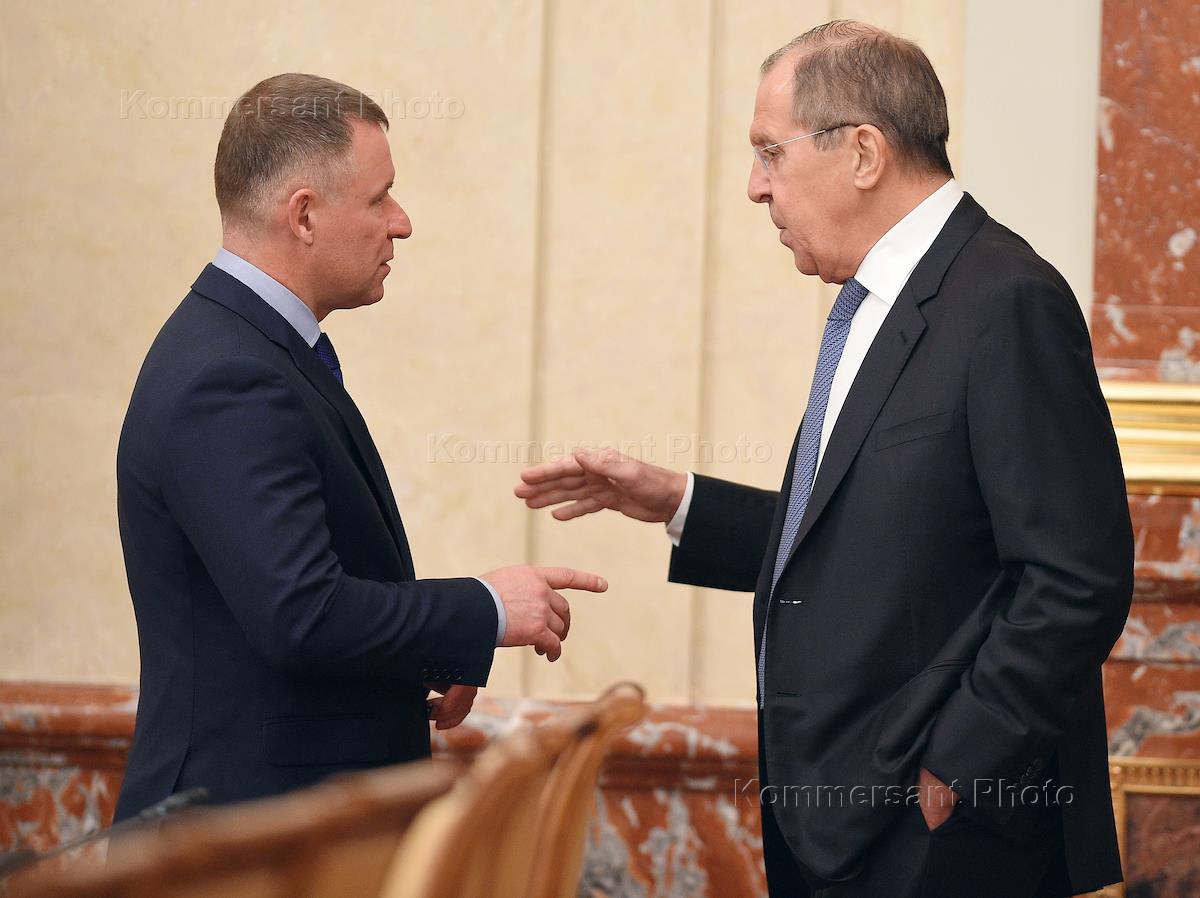 Meeting of the Russian government. Russian Minister of Civil Defense, Emergencies and Disaster Relief Evgeny Zinichev (left) and Russian Foreign Minister Sergei Lavrov (right) before the meeting.