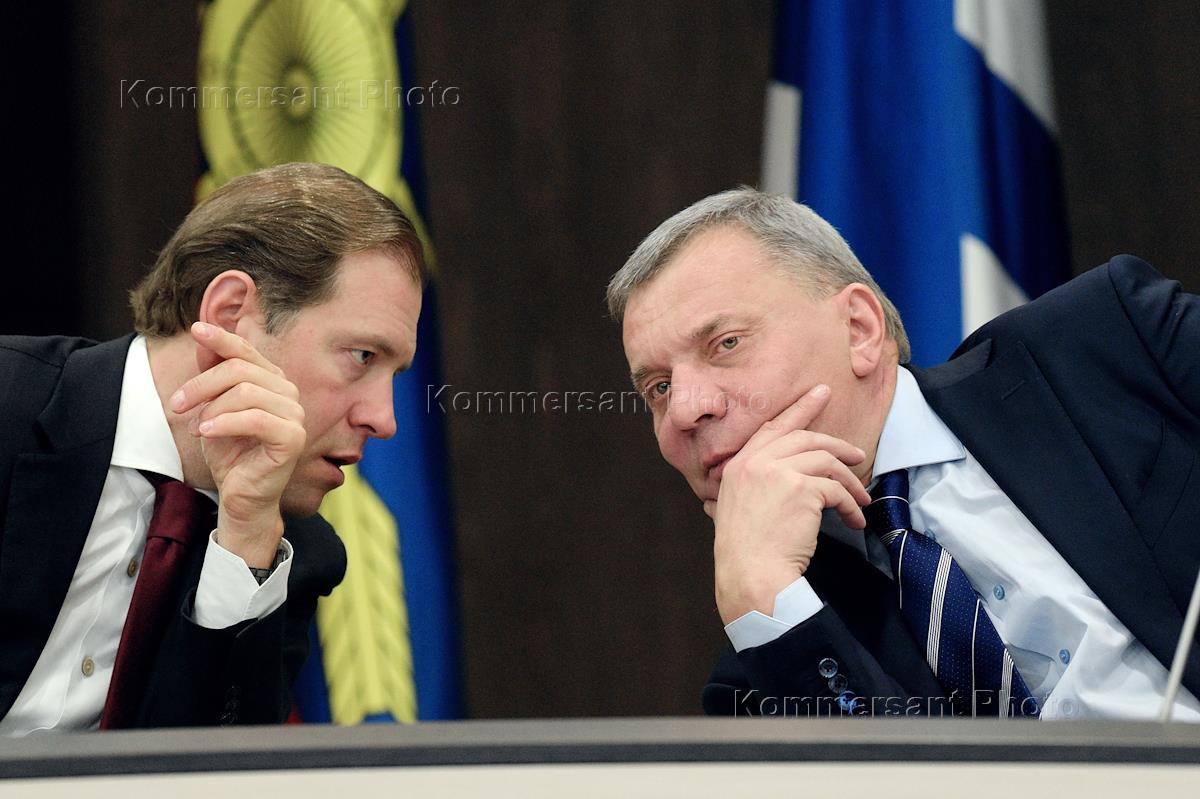 Working visit of Russian President Vladimir Putin to Anapa. The final meeting with the leadership of the Russian Ministry of Defense and defense enterprises. Russian Minister of Industry and Trade Denis Manturov (left) and Deputy Prime Minister Yury Borisov (right) during the meeting.