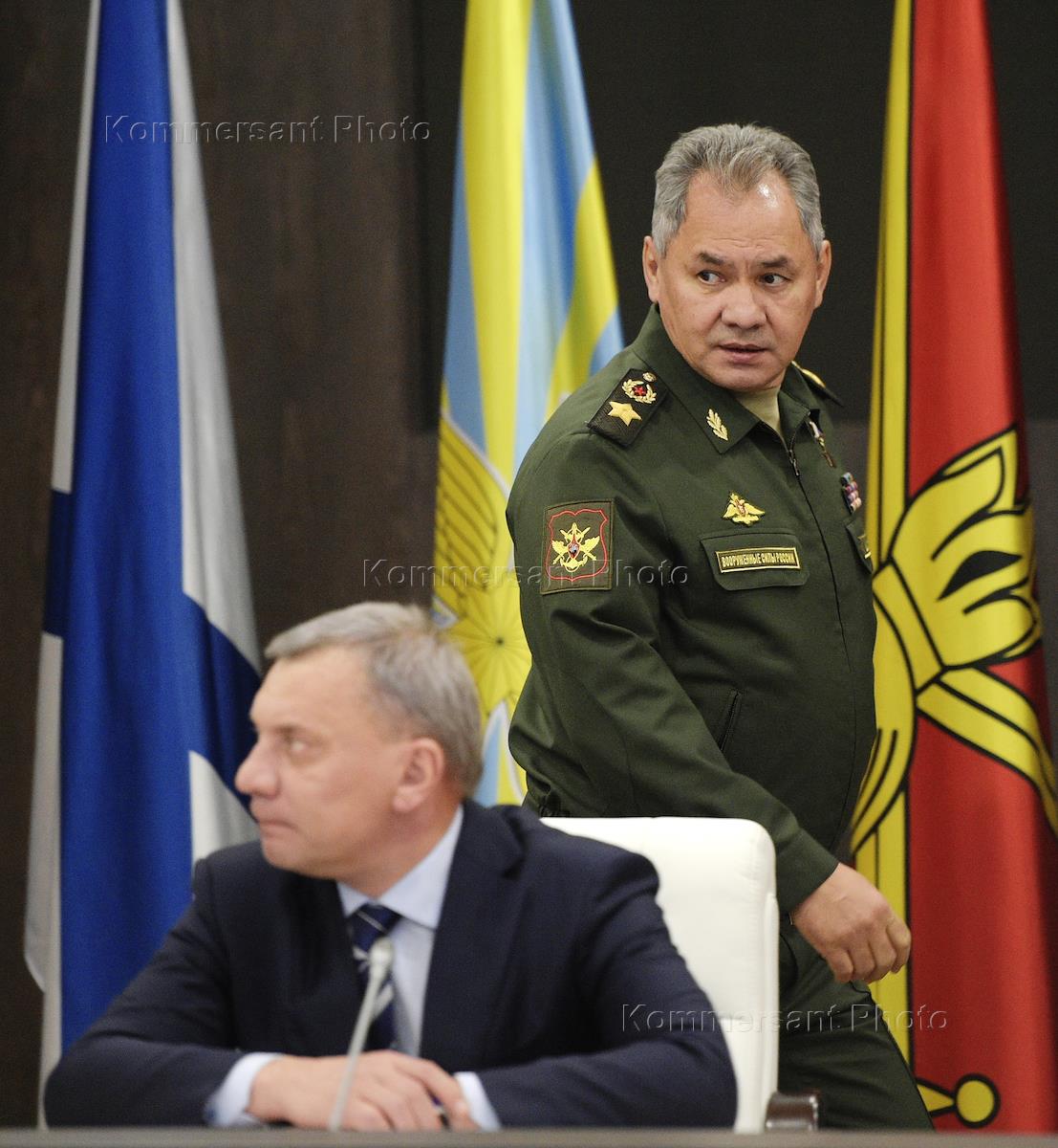 Working visit of Russian President Vladimir Putin to Anapa. The final meeting with the leadership of the Russian Ministry of Defense and defense enterprises. Russian Deputy Prime Minister Yury Borisov (left) and Russian Defense Minister Sergey Shoigu (right) during the meeting.