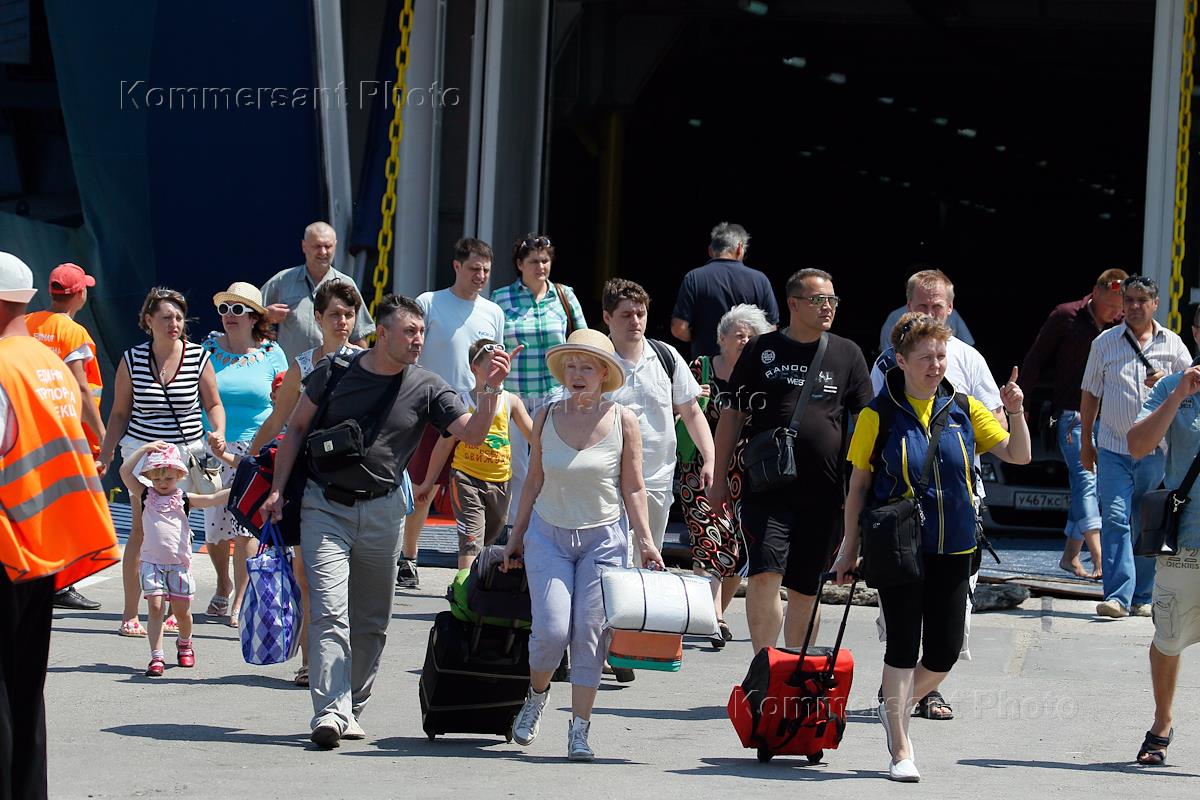 Road trip "Moscow-Crimea". Port Kavkaz. Marine Station. Tourists traveling on a ferry in the Kerch Strait.