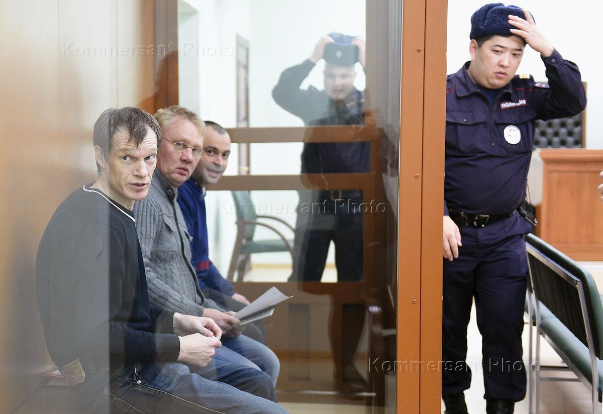 A court hearing of the case involving Oleg Dmitriev, Oleg Ivanov and Sergey Ozerov, members of the movement "Artpodgotovka", accused of preparing a terrorist attack and being a part of a terrorist community, was held in the Moscow District Military Court. Left to right: defendants Oleg Ivanov, Sergey Ozerov and Oleg Dmitriev during the hearing.
