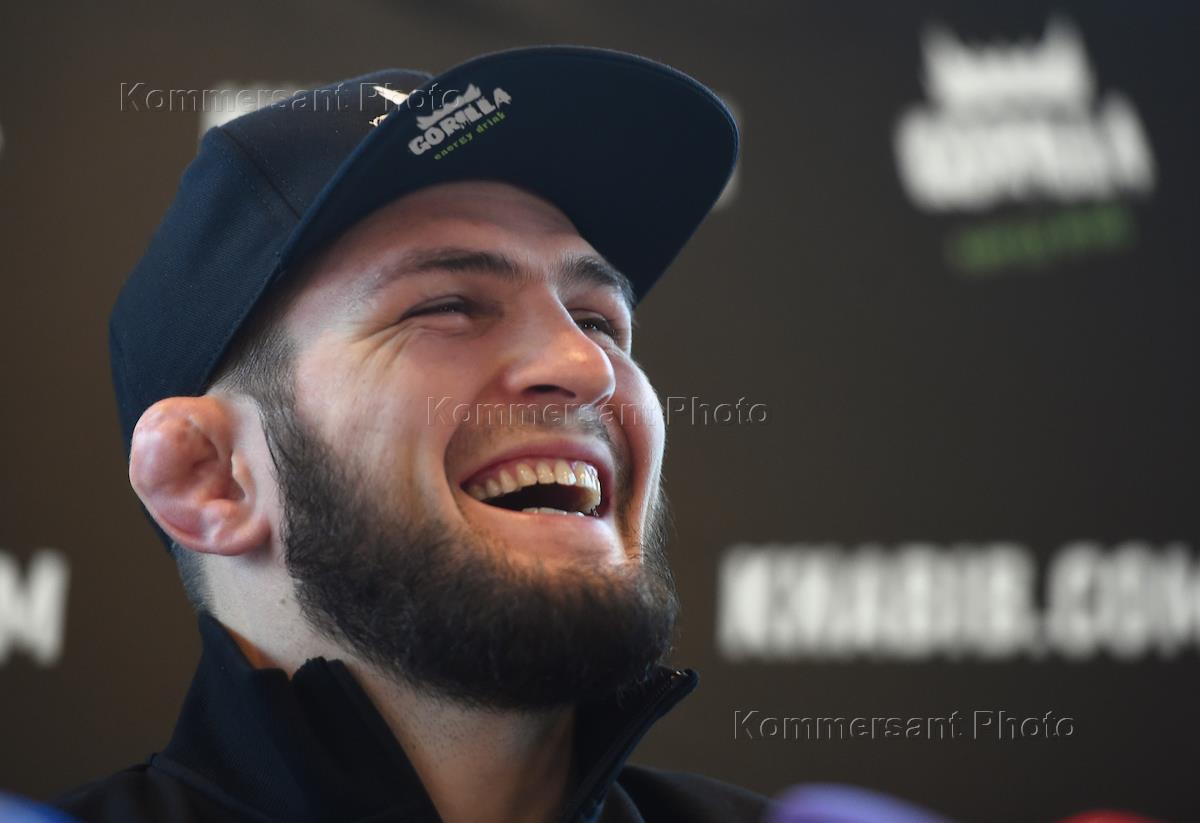 Боец смешанных боевых искусств Хабиб Нурмагомедов во время пресс-конференции, посвященной победе над Конором Макгрегором и защите титула чемпиона UFC в легком весе, в бизнес-лофте "Над Москвой".