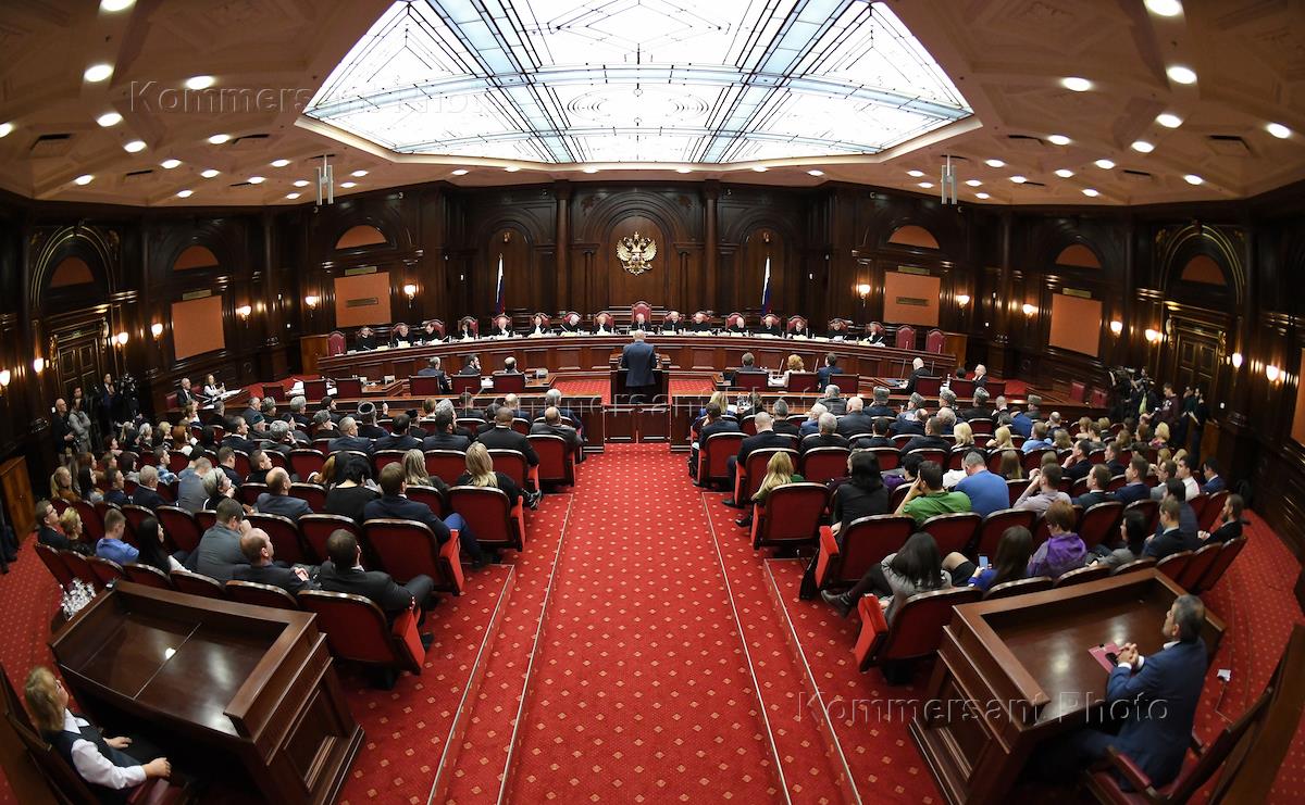 Заседание Конституционного суда (КС) России о проверке конституционности Соглашения об установлении границы между Республикой Ингушетия и Чеченской Республикой и утвердившего его Закона Республики Ингушетия . Слева направо: заместитель председателя КС России Ольга Хохрякова, председатель КС России Валерий Зорькин и его заместитель Сергей Маврин во время заседания.