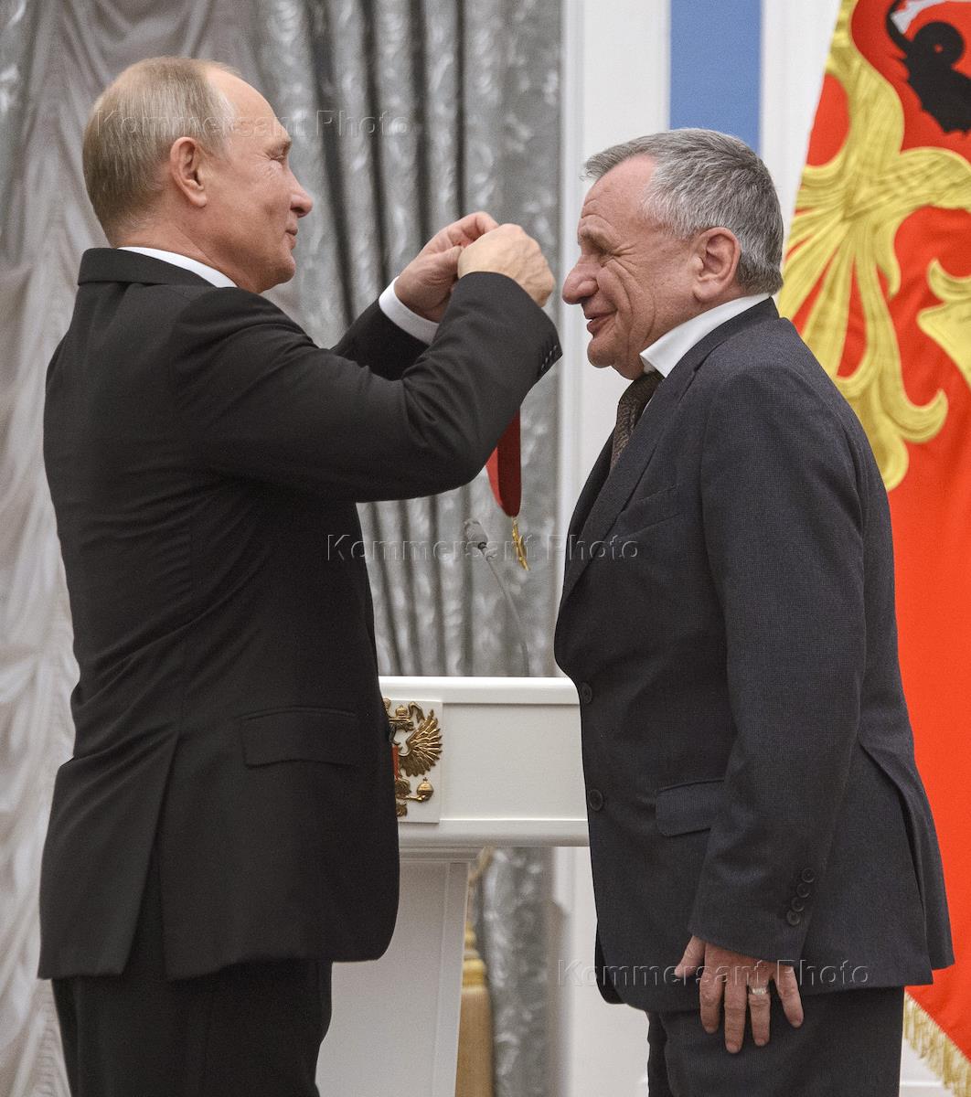 The ceremony of the state awards presentation was held in the Ekaterininsky Hall of the Kremlin. Russian President Vladimir Putin (left) and President of Research and Development institution "Kurchatovsky institute" Mikhail Kovalchuk (right) during the ceremony.