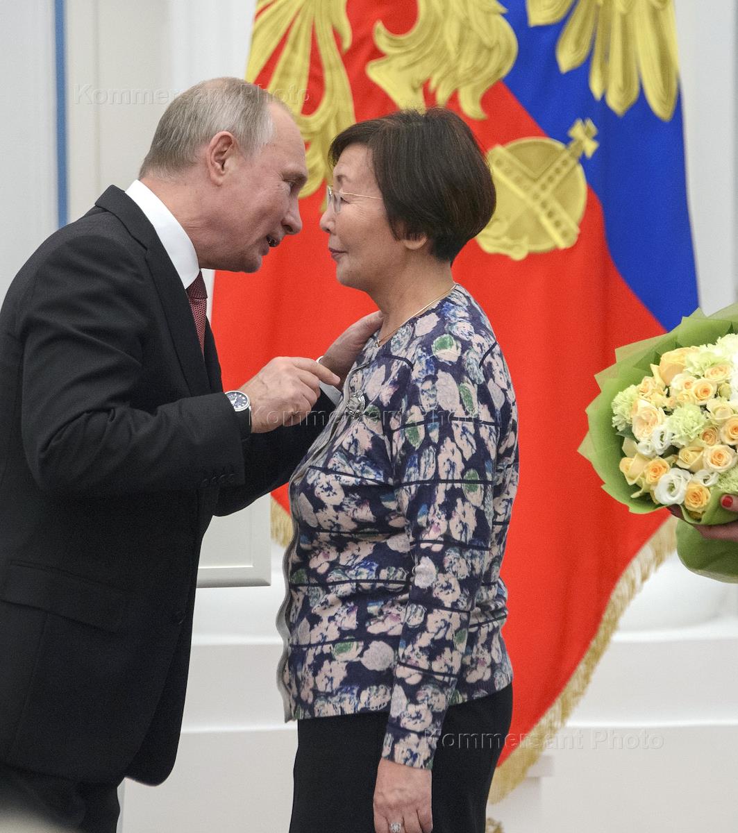 The ceremony of the state awards presentation was held in the Ekaterininsky Hall of the Kremlin. Russian President Vladimir Putin (left) and Tatiana Afanasyeva (center), artist at the Imperial Porcelain during the ceremony.