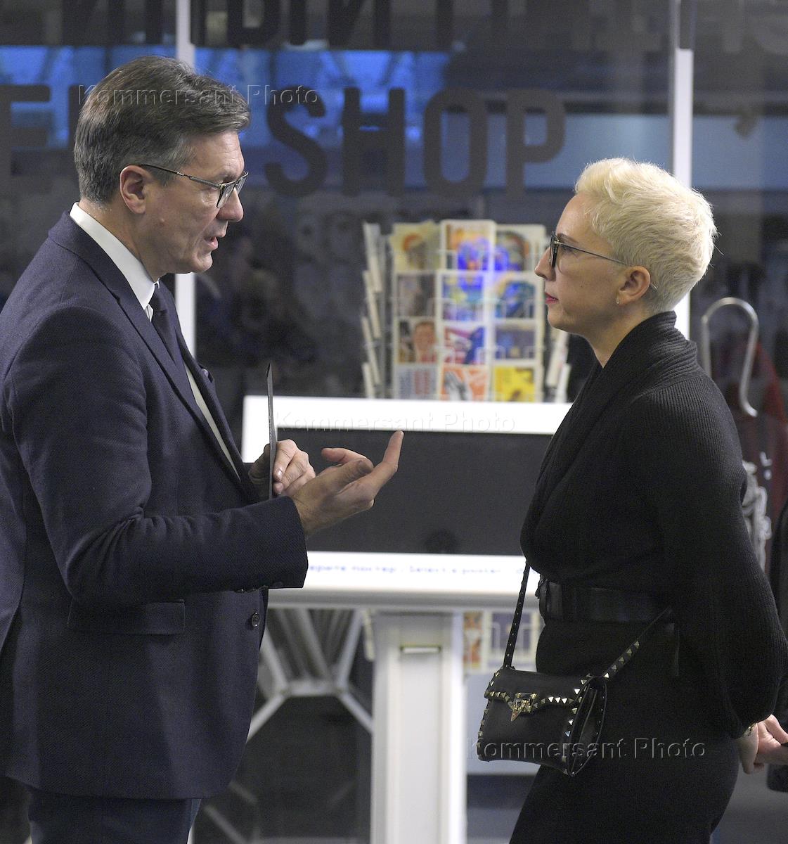 Премьера оперы композитора Ильи Демуцкого "Для Черного квадрата" прошла в Новой Трятьяковке на Крымском валу. Главный редактор журнала Snob Сергей Николаевич (слева) и директор по маркетингу и рекламе группы компаний AZIMUT Hotels Елена Пальчунова (справа) на премьере.