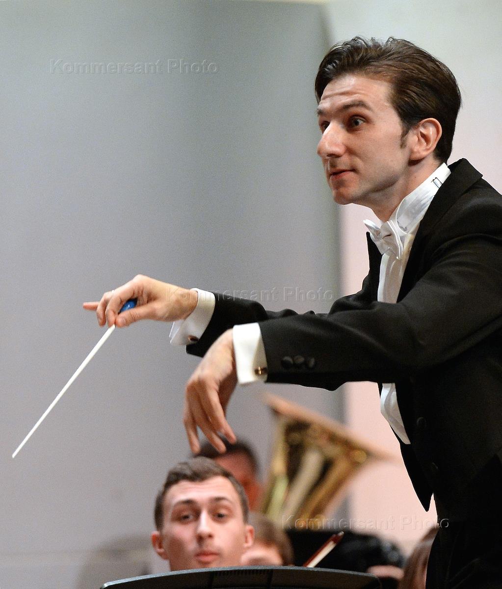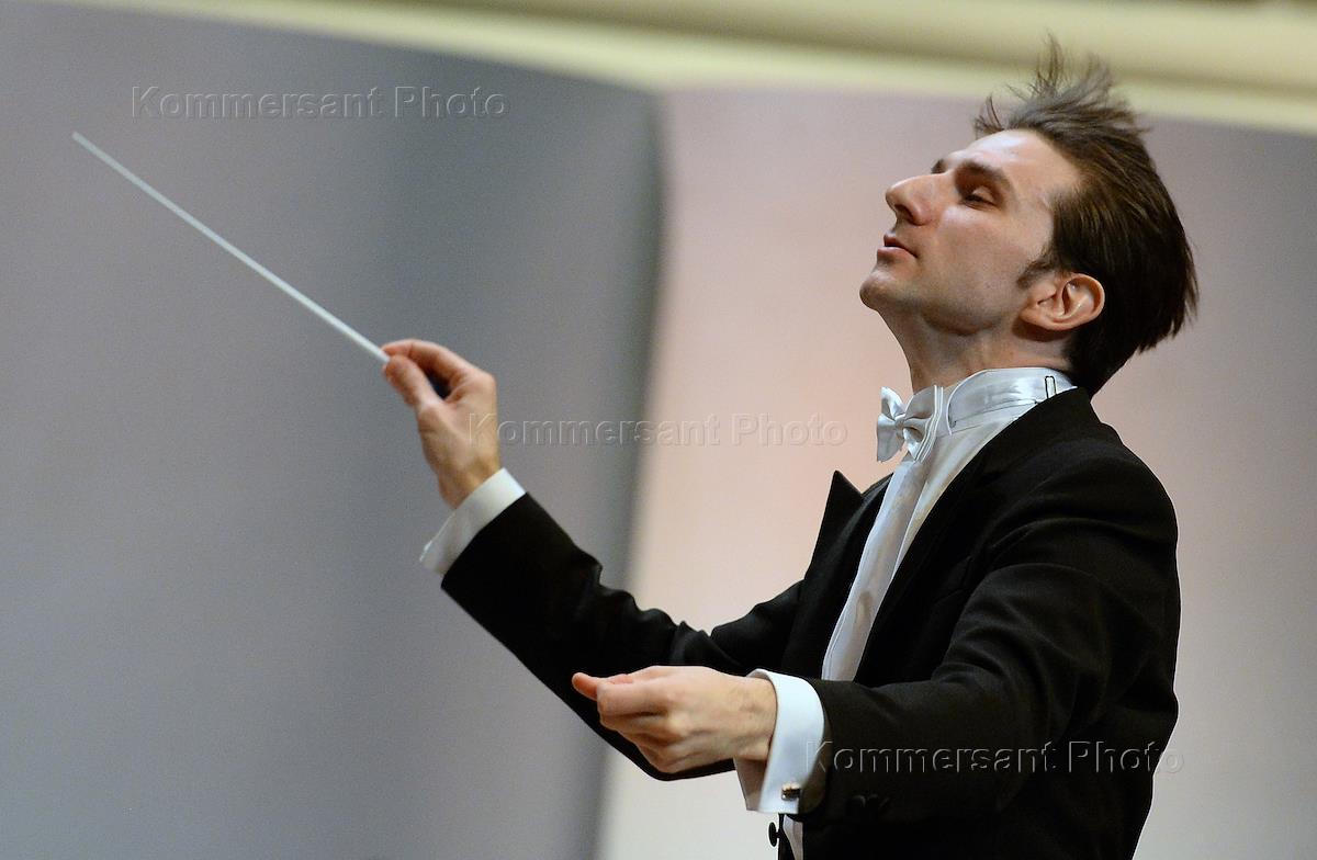 Концерт-презентация Российского национального молодежного симфонического оркестра в концертном зала им. Чайковского. Дирижер Алексей Рубин во время концерта.