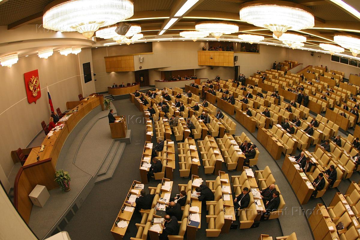 Заместитель председателя Комитета Государственной Думы России по делам Федерации и региональной политике Юрий Конев (в центре) на заседании Госдумы.
