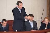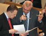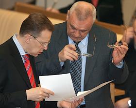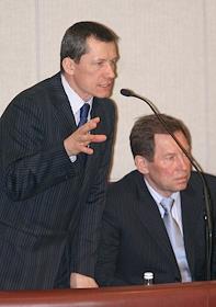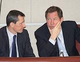 Заместитель Министра экономического развития и торговли России Андрей Шаронов (слева) и заместитель руководителя Федерального Агентства по строительству и ЖКХ (Росстрой) Владимир Коган (справа) на заседании Государственной Думы России.