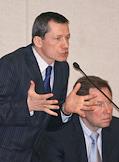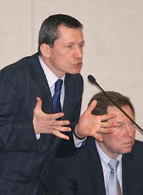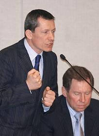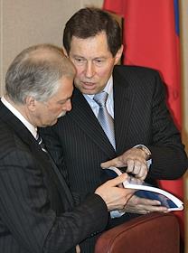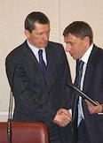 Заместитель Министра экономического развития и торговли России Андрей Шаронов (слева) и министр регионального развития России Владимир Яковлев (справа) на заседании Государственной Думы России.