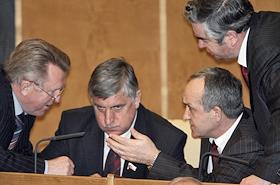 Заместитель Министра экономического развития и торговли России Андрей Шаронов (слева) и министр регионального развития России Владимир Яковлев (второй слева) на заседании Государственной Думы России.
