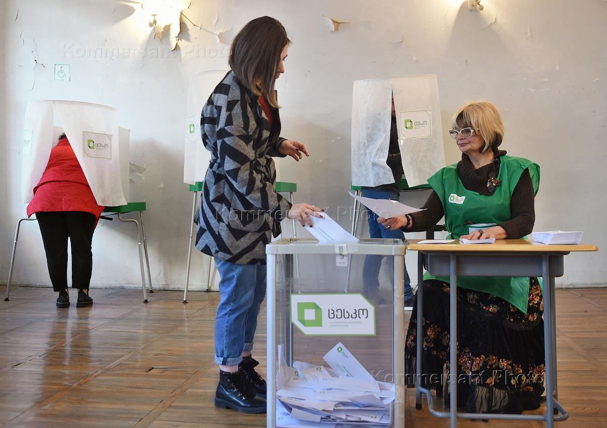Presidential elections in Georgia. Salome Zurabishvili (center), candidate for presidency, leader of the "Path of Georgia" party at one of the polling stations during the second round of the presidential elections.