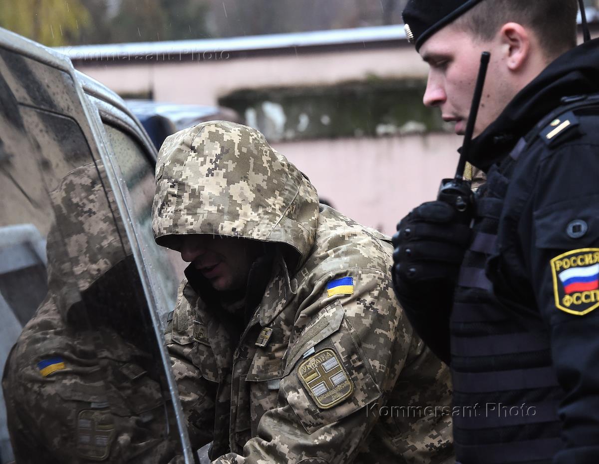 An officer of the Russian Federal Security Service delivers to the the Kievsky District court of Simferopol detained Ukrainian sailors from three ships of the Ukrainian Navy: "Nikopol", "Berdyansk" and "Yany Kapu", that were seized in the Kerch Strait area on November 25. The sailors are accused of illegal Russian border crossing.
