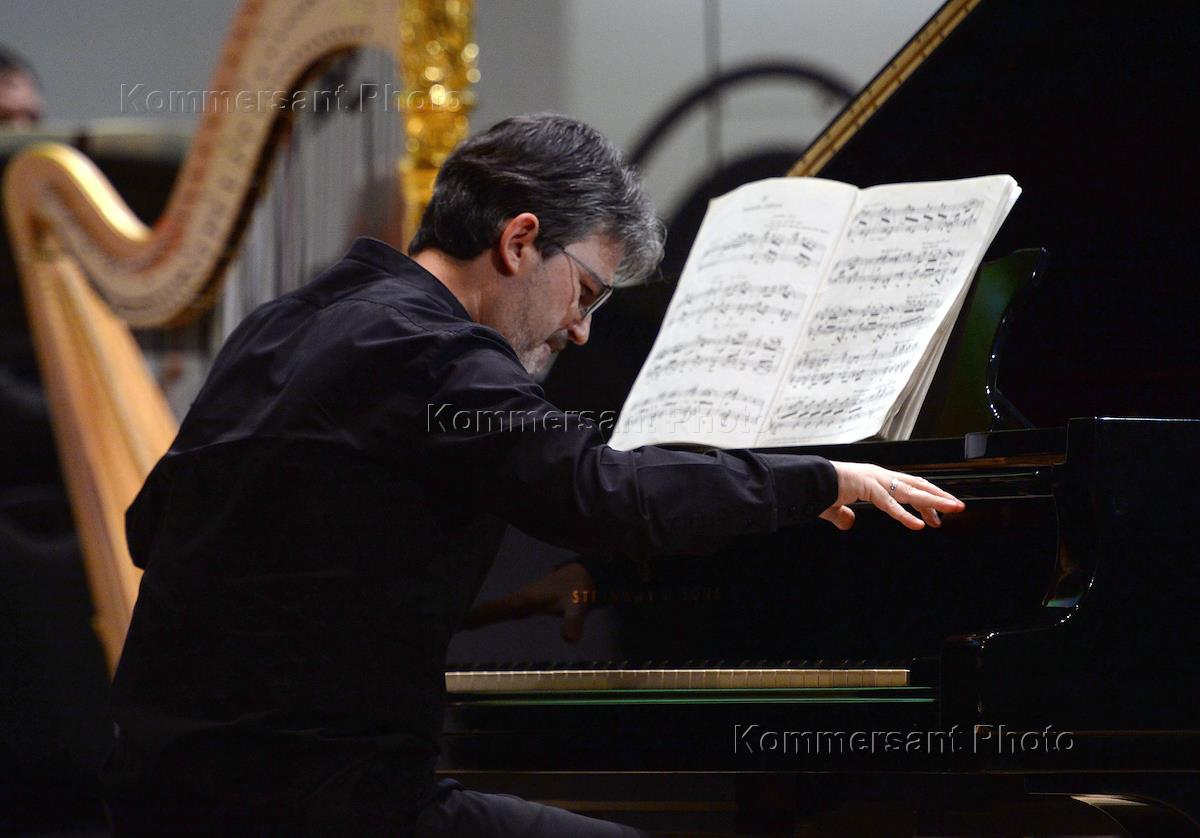 Концерт скрипачки Патриции Копачинской прошел на сцене Концертного зала им. Чайковского. Дирижер Государственного академического симфонического оркестра России имени Евгения Светланова Владимир Юровский во время концерта.