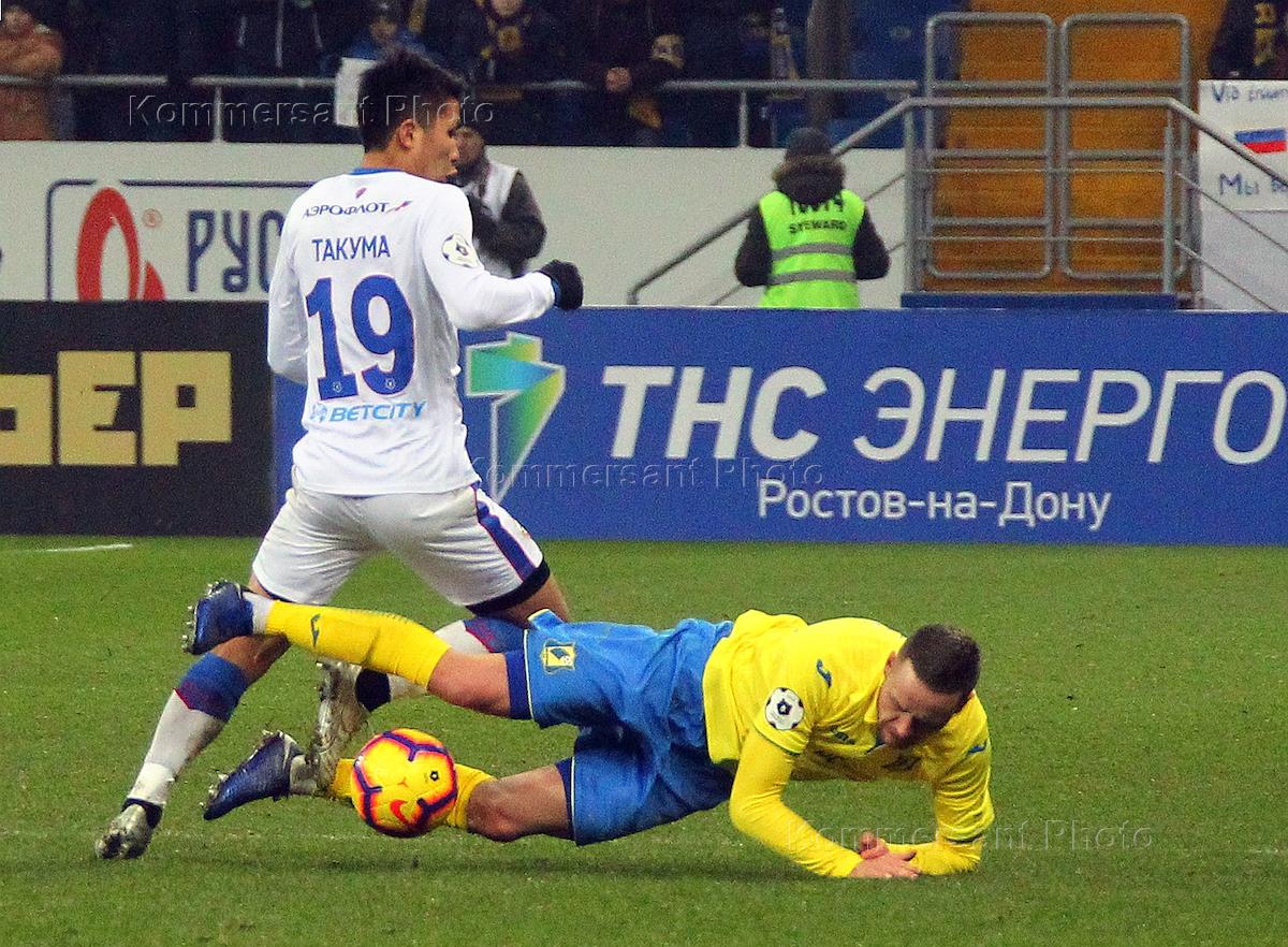 Российская Премьер-лига (РПЛ). Чемпионат России по футболу 2018/2019. 16-й тур. Матч между командами ЦСКА (Москва) и "Ростов" (Ростов-на-Дону) на стадионе "Ростов Арена". Игрок команды ЦСКА Такума Нисимура (слева) во время матча.