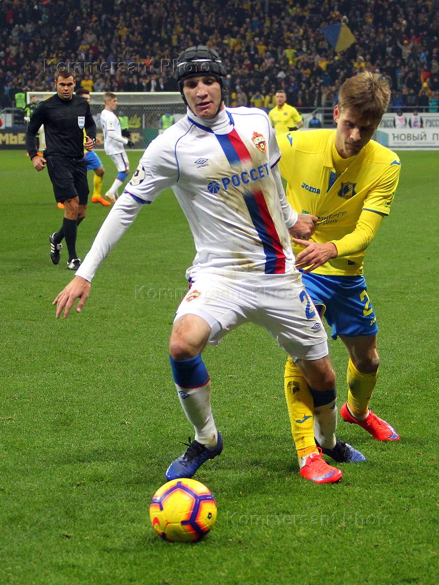 Российская Премьер-лига (РПЛ). Чемпионат России по футболу 2018/2019. 16-й тур. Матч между командами ЦСКА (Москва) и "Ростов" (Ростов-на-Дону) на стадионе "Ростов Арена". Игрок команды "Ростов" Арсений Логашов (справа) и игрок команды ЦСКА Марио Фернандес (слева) во время матча.