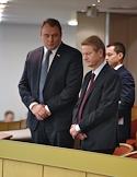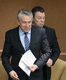 Пленарное заседание Государственной думы (ГД) России. Член комитета ГД России по информационной политике, информационным технологиям и связи Вадим Деньгин (в центре) и член комитета ГД России по аграрным вопросам Виталий Пашин (справа) во время заседания.