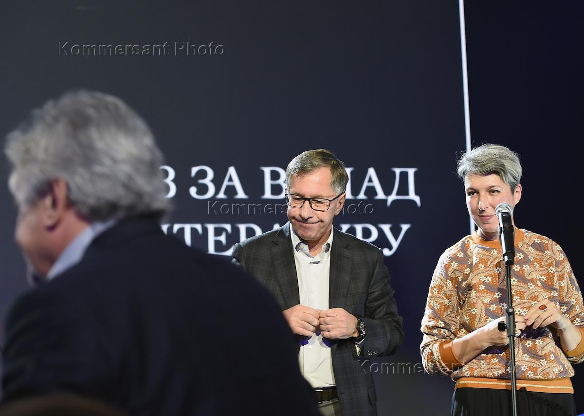 Церемония вручения национальной литературной премии "Большая книга" в Доме Пашкова. Слева направо: писатели Александр Архангельский, Дмитрий Быков и Мария Степанова во время церемонии.