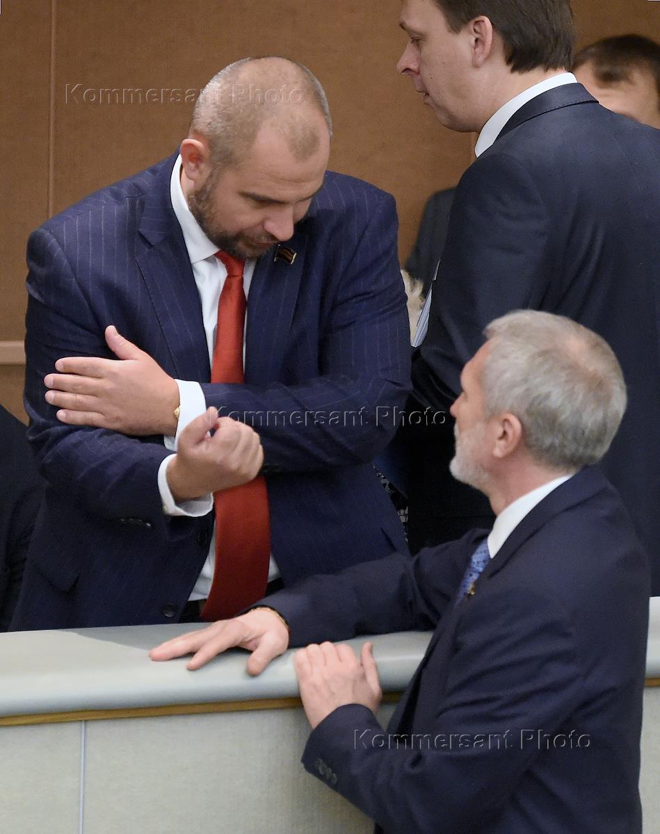Пленарное заседание Государственной думы (ГД) России. Председатель партии "Коммунисты России" Максим Сурайкин (слева) и член комитета ГД России по экономической политике, инновационному развитию и предпринимательству Алексей Журавлев (справа) во время заседания.