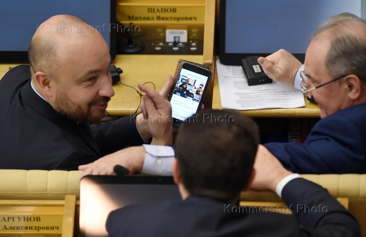 Пленарное заседание Государственной думы (ГД) России. Слева направо: член Комитета ГД России по бюджету и налогам Михаил Щапов, член комитета ГД России по природным ресурсам, собственности и земельным отношениям Владимир Блоцкий и член комитета ГД России по безопасности Николай Езерский во время заседания.
