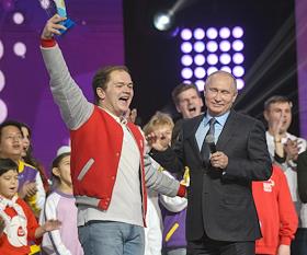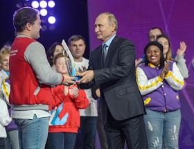 Церемония вручения ежегодной премии "Доброволец России – 2018", которая состоялась в рамках Международного форума добровольцев во дворце спорта "ЦСКА Арена". Президент России Владимир Путин (справа) и автор проекта "Здоровое село" (Смоленская область) Антон Коротченко (слева) во время церемонии.