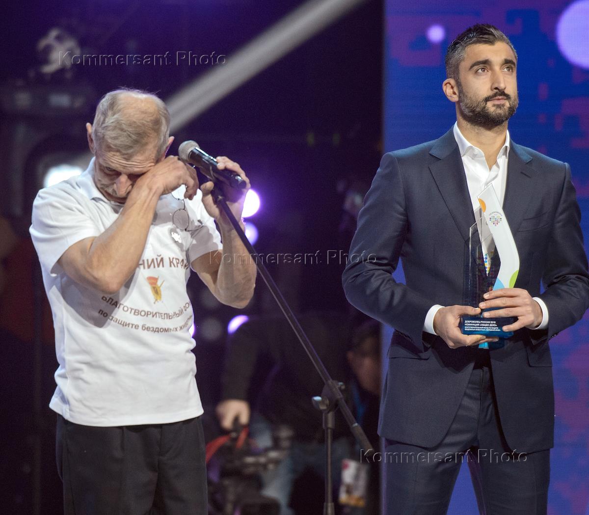 Церемония вручения ежегодной премии "Доброволец России – 2018", которая состоялась в рамках Международного форума добровольцев во дворце спорта "ЦСКА Арена". Кинолог, владелец приюта для животных "Гвардия" Сергей Фокин (слева) и футболист Александр Самедов (справа) во время церемонии.