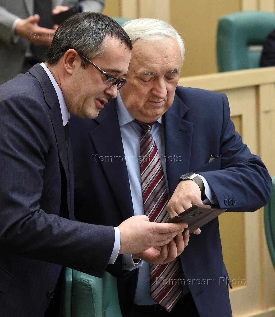 VI Съезд Общероссийской общественной организации "Всероссийский Совет местного самоуправления" (ВСМС) прошел в Совете Федерации России. Председатель Московской городской думы Алексей Шапошников (слева) и представитель в Совете Федерации России от исполнительного органа государственной власти Тюменской области Степан Киричук (справа) во время работы съезда.