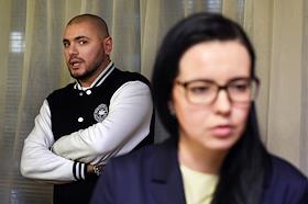 Круглый стол, посвященный отмене концертов некоторых рэп-исполнителей в регионах России, организованный молодежным парламентом при Государственной думе России. Рэп-исполнитель Птаха (Давид Нуриев) (справа) во время заседания круглого стола.