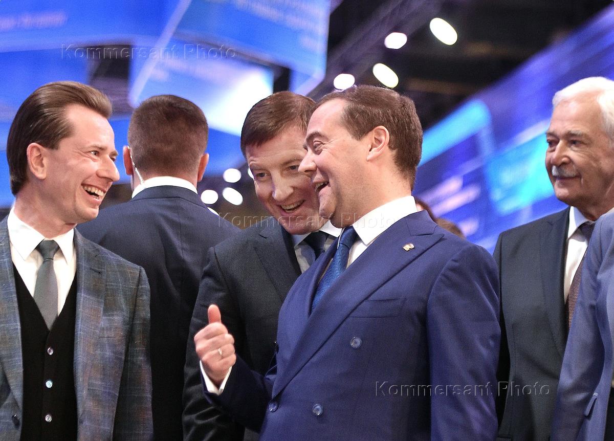 XVIII Съезд Всероссийской политической партии "Единая Россия" в международном выставочном центре "Крокус Экспо". Председатель Всероссийской политической партии "Единая Россия", председатель правительства России Дмитрий Медведев (слева) и глава Республики Коми Сергей Гапликов (справа) во время работы съезда.