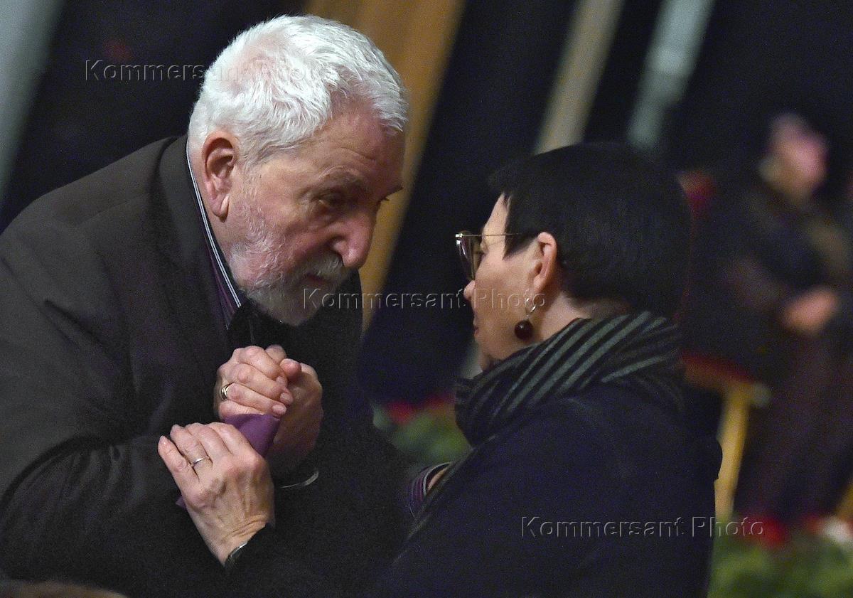 Церемония прощания с председателем Московской Хельсинской группы Людмилой Алексеевой прошла в Центральном доме журналиста (Домжур). Председатель партии народной свободы (ПАРНАС) Михаил Касьянов (второй слева), публицист, общественный деятель Алла Гербер (слева) и сын Людмилы Алексеевой Михаил (в центре) во время церемонии.