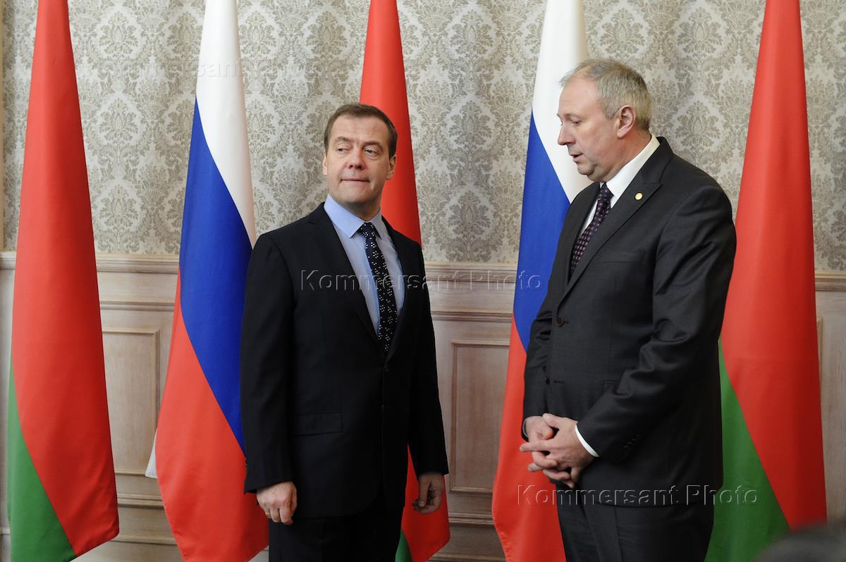 Рабочая поездка председателя правительства России Дмитрия Медведева в Белоруссию. Заседание Совета министров Союзного государства России и Белоруссии. Премьер-министр Белоруссии Сергей Румас (слева) и председатель правительства России Дмитрий Медведев (справа) во время заседания.